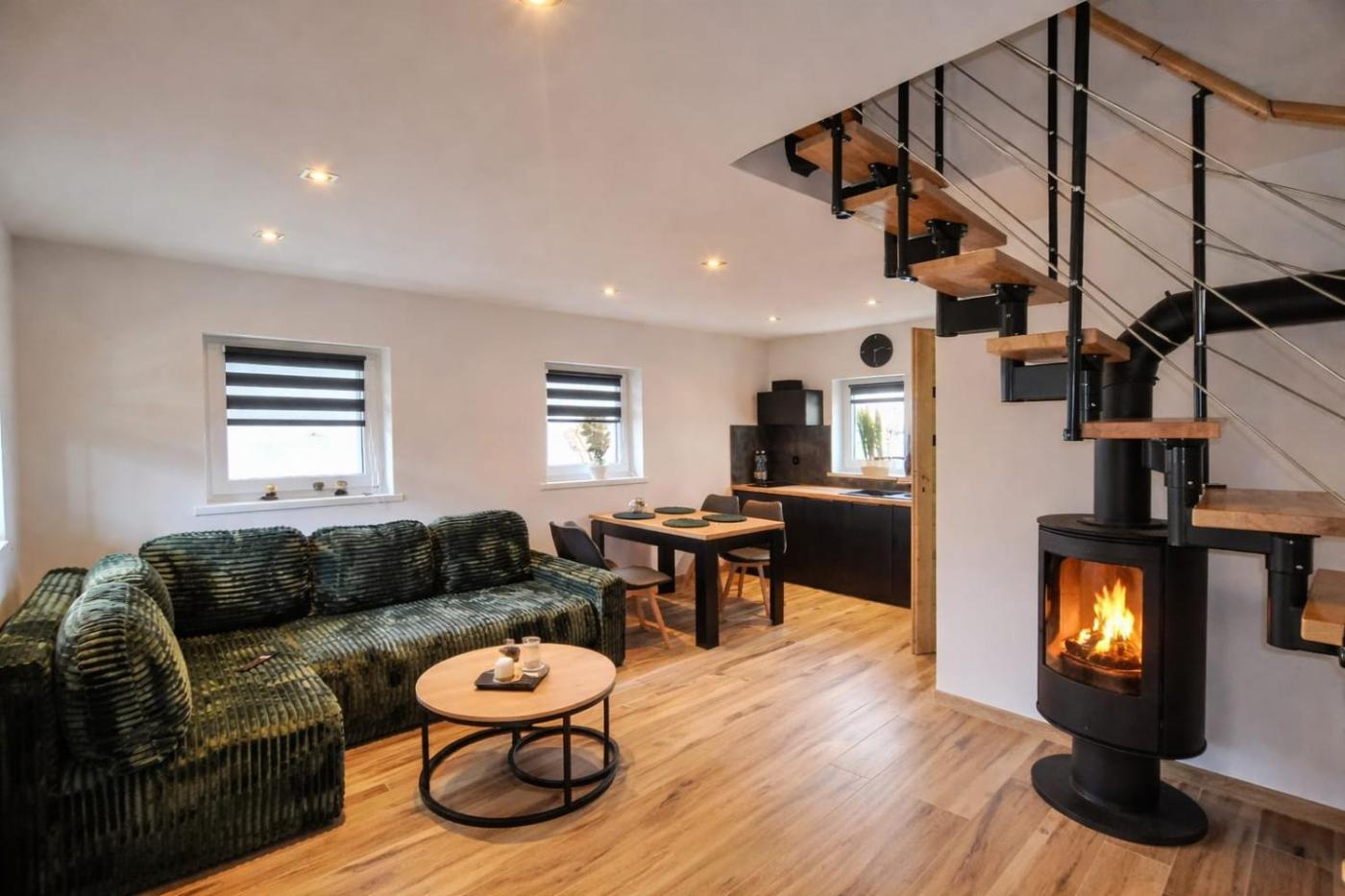 Dom z 1 sypialnią. This holiday homes standout feature is the fireplace. Featuring a private entrance, this holiday home is comprised of 1 living room, 1 separate bedroom and 1 bathroom with a shower. In the well-equipped kitchen, guests will find a stovetop, a refrigerator, kitchenware and a microwave. Boasting a terrace with garden views, this holiday home also offers a dining area and a flat-screen TV. The unit offers 5 beds. Dom wakacyjny - 6 osobowy. Powierzchnia pokoju ok.: 60 mkw. ;